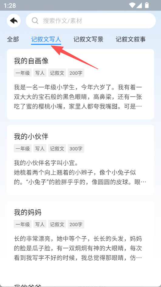 2、范文庫分類細致,明確劃分記敘文寫人、記敘文寫景、記敘文敘事等類別,讓范文查找更具針對性。