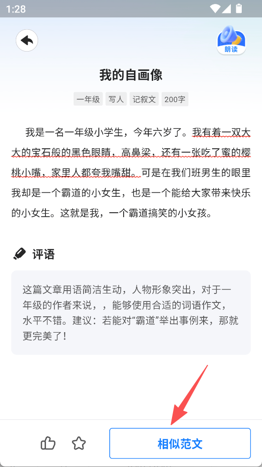 3、進入范文詳情頁,能看到作文評語,還可點擊“相似范文”查看同類作文。