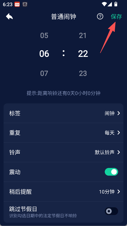 1、鬧鐘自定義程度高,時間、標簽、重復方式、鈴聲均可自主設置,還能開啟震動、調整稍后提醒時長、選擇是否跳過節假日。