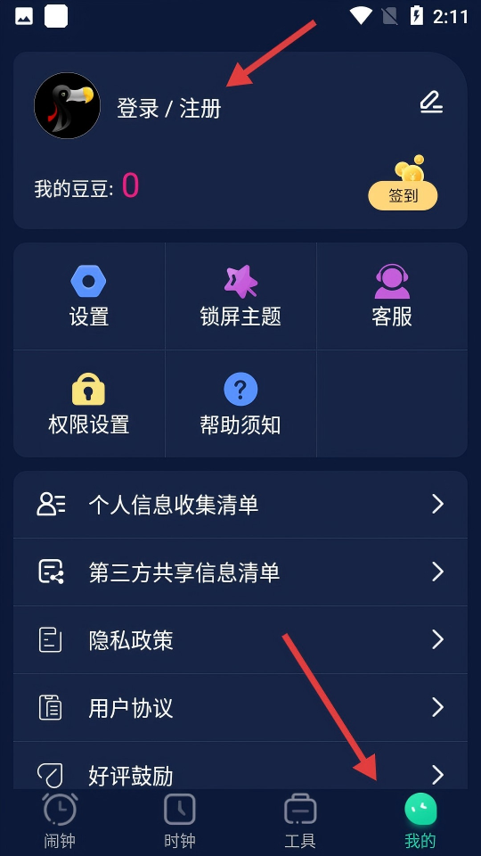3、支持功能板塊切換,底部設有“鬧鐘”“時鐘”“工具”“我的”板塊,可在不同功能間切換操作。