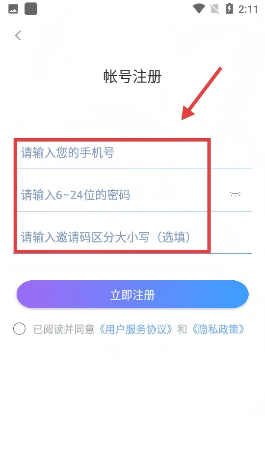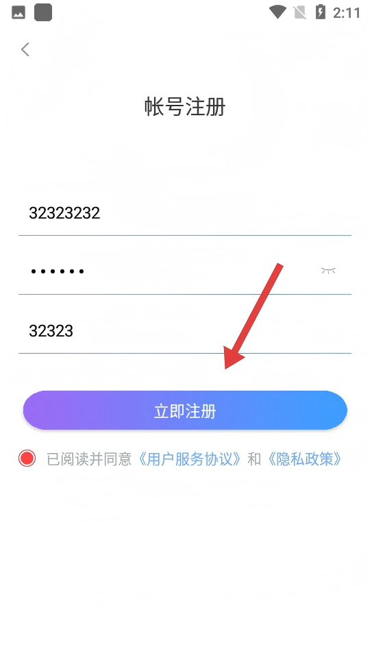 4、填寫手機號、密碼后點擊【立即注冊】,完成賬號注冊操作。