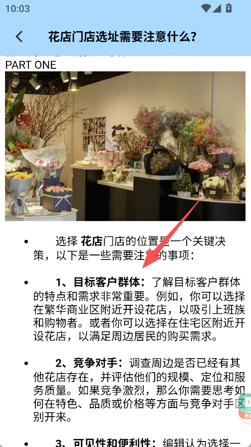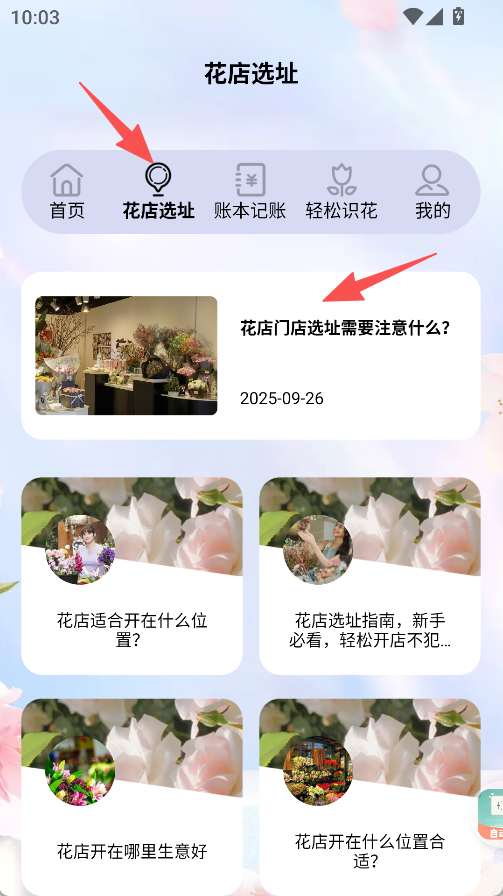 1、點(diǎn)擊“花店選址”,查看“花店門店選址需要注意什么”等內(nèi)容。