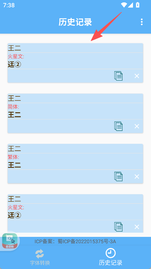 3、點擊“歷史記錄”、查看過往的字體轉換內容。