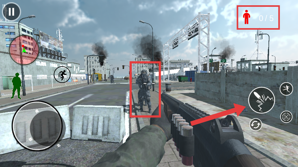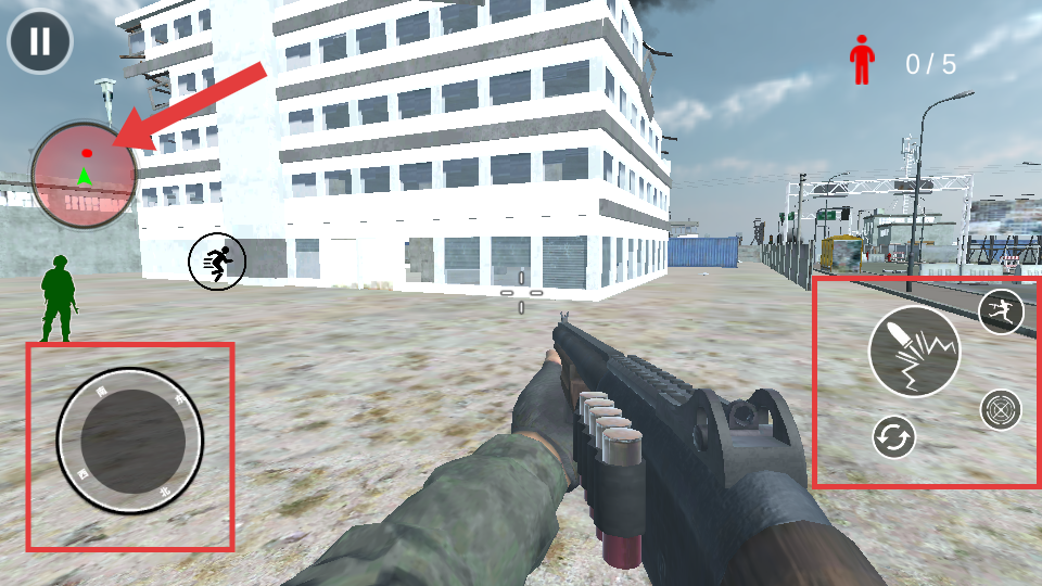 3、關(guān)注右上角【人-0/5】的目標(biāo)數(shù)量提示,發(fā)現(xiàn)如畫(huà)面中框選的敵人時(shí),迅速瞄準(zhǔn)并射擊將其消滅。