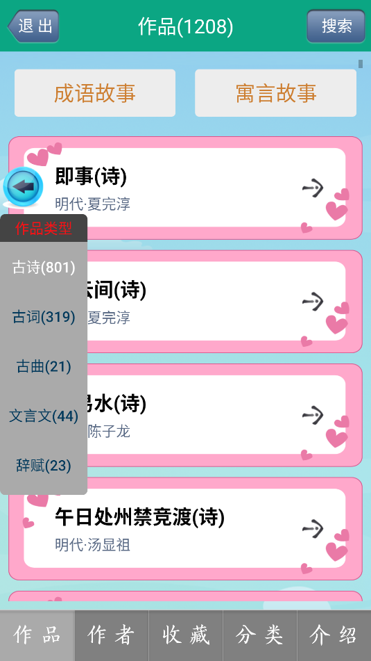 2、進(jìn)入唐詩(shī)三百首,可根據(jù)類型尋找想要的古詩(shī)詞,底部還可以通過(guò)作者、作品來(lái)查詢。