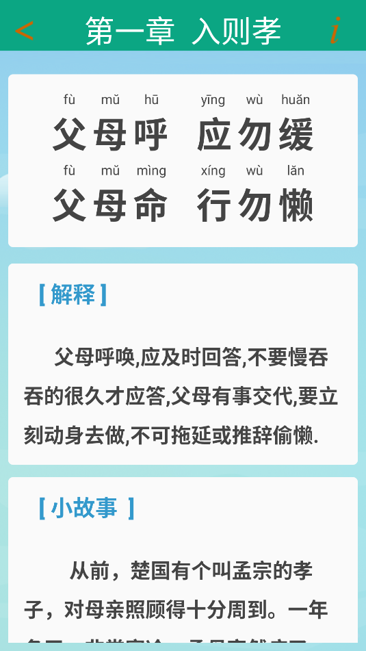 3、界面呈現(xiàn)了弟子規(guī)的段選,下方配有解釋,可助力學(xué)習(xí)傳統(tǒng)孝文化。