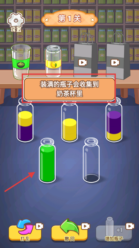 1、理解規則,裝滿的瓶子會入奶茶杯,先處理滿的【綠色】瓶,其可直接被收集,開啟分類流程。