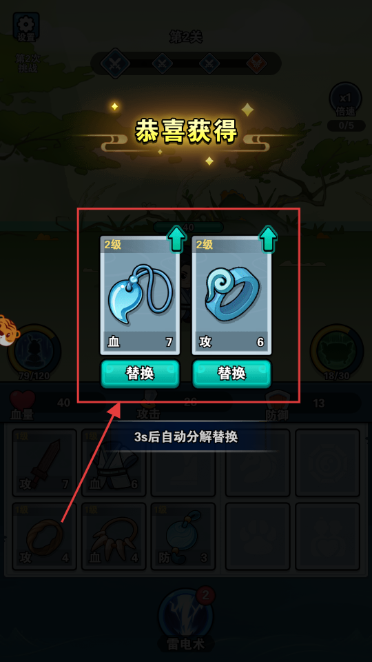 2、擊敗怪物獲2級裝備后,及時點擊【替換】提升【血】-【攻】屬性,也可等3秒自動分解替換。