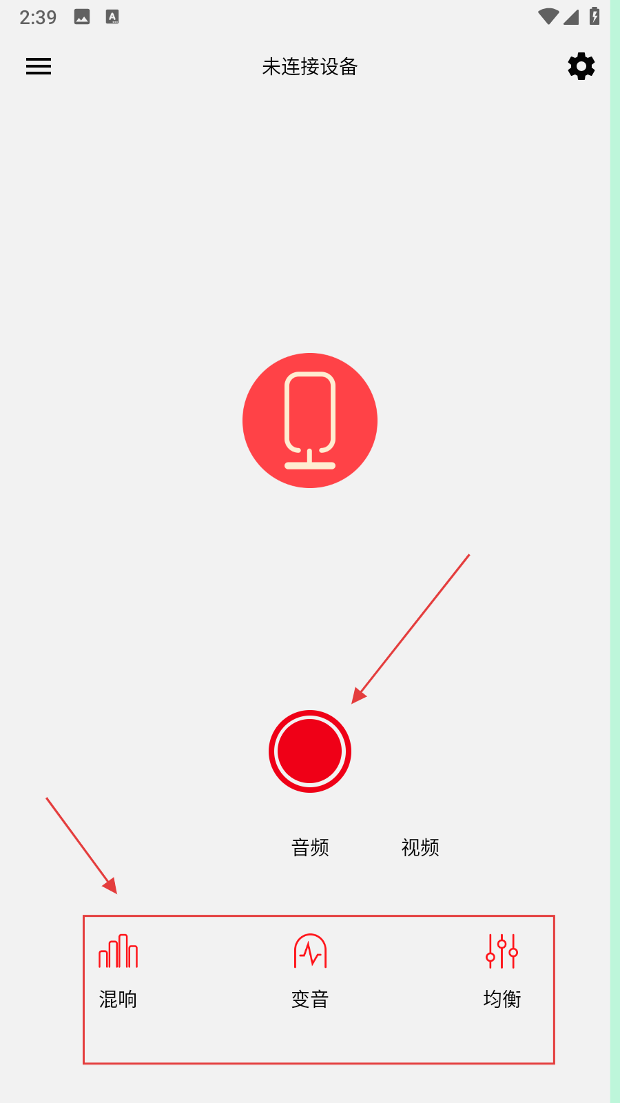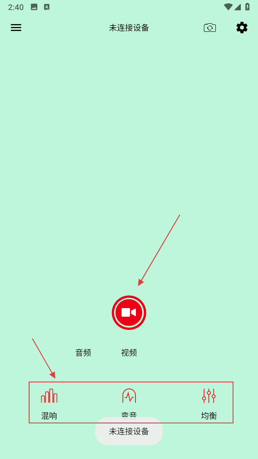 4、在視頻模式主界面,可點擊【錄制按鈕】,然后調節【混響、變音、均衡】效果。