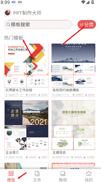 1、進入《PPT制作大師》可以瀏覽到多個熱門模板分類,不同風(fēng)格與場景的模板清晰呈現(xiàn),方便快速選擇合適的方案。