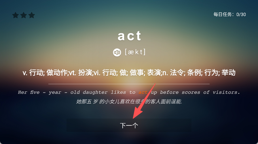 3、在單詞學習頁面,查看單詞的音標、釋義及例句,點擊“下一個”,繼續學習后續單詞。