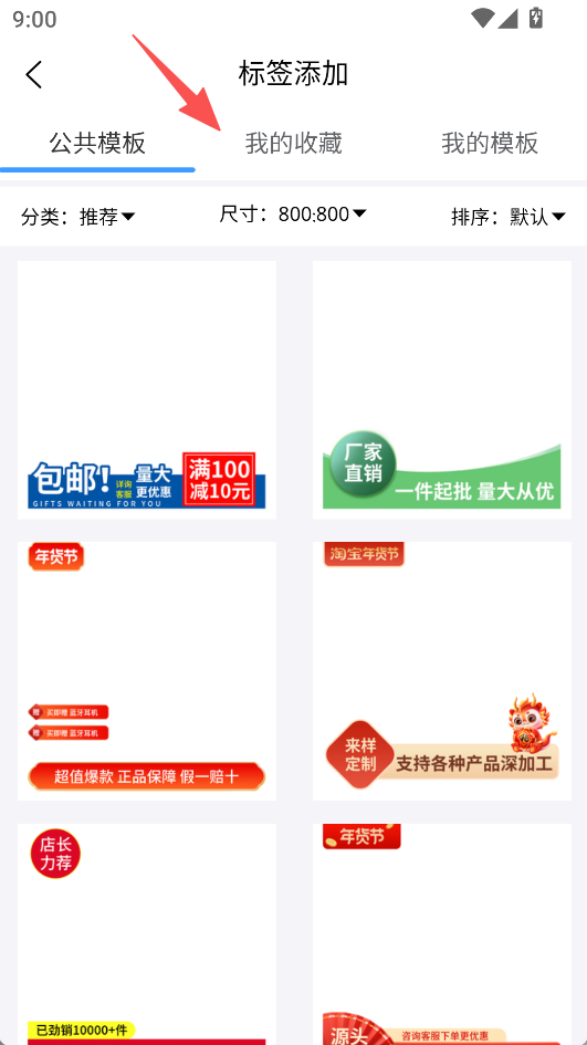 1、標簽添加模塊分類清晰,公共模板等類別下有豐富樣式,可直接選取用于電商圖片的標簽裝飾。