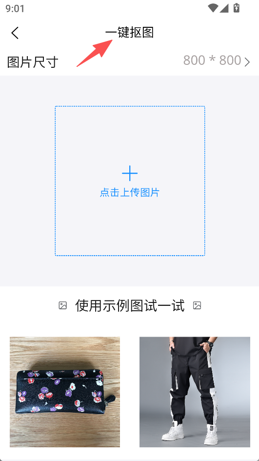 2、一鍵摳圖功能高效實用,支持上傳圖片或使用示例圖,能快速分離圖片主體與背景,滿足摳圖需求。