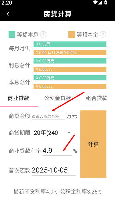 3、進(jìn)入房貸計(jì)算器后,只需輸入貸款金額、利率以及首次還款日期,系統(tǒng)會(huì)自動(dòng)運(yùn)算并給出每月應(yīng)還款額,幫助快速了解貸款壓力。