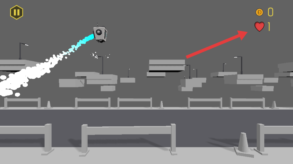 2、操控飛行器前進(jìn),關(guān)注右上角生命值,心形圖標(biāo),躲避沿途灰色障礙物,保持飛行安全。