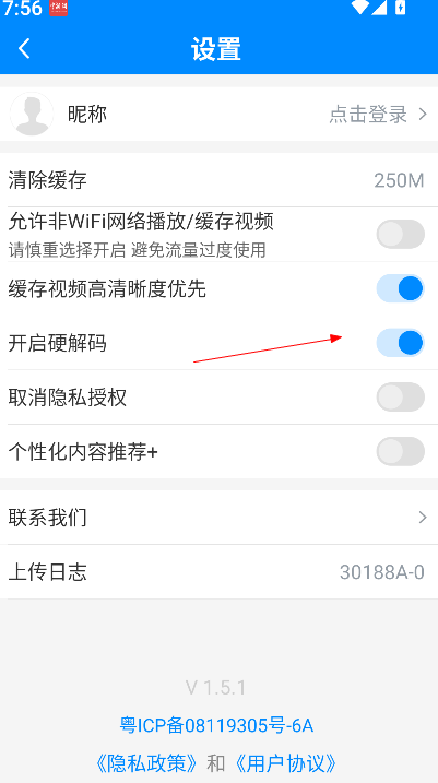 3、在設(shè)置頁面中找到“硬解碼”開關(guān),點擊開啟即可提升視頻播放的流暢度與穩(wěn)定性。