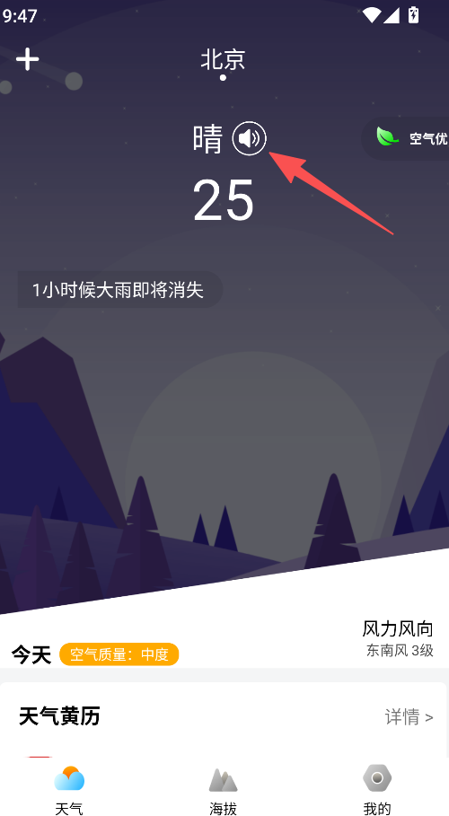 3、在天氣頁面,點(diǎn)擊語音圖標(biāo)聽取天氣情況播報(bào),便捷獲取天氣信息。