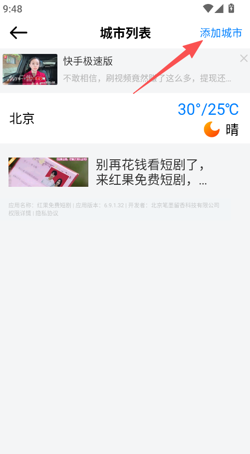 1、進(jìn)入城市列表、點(diǎn)擊添加城市、添加后查看多地實(shí)時(shí)天氣。