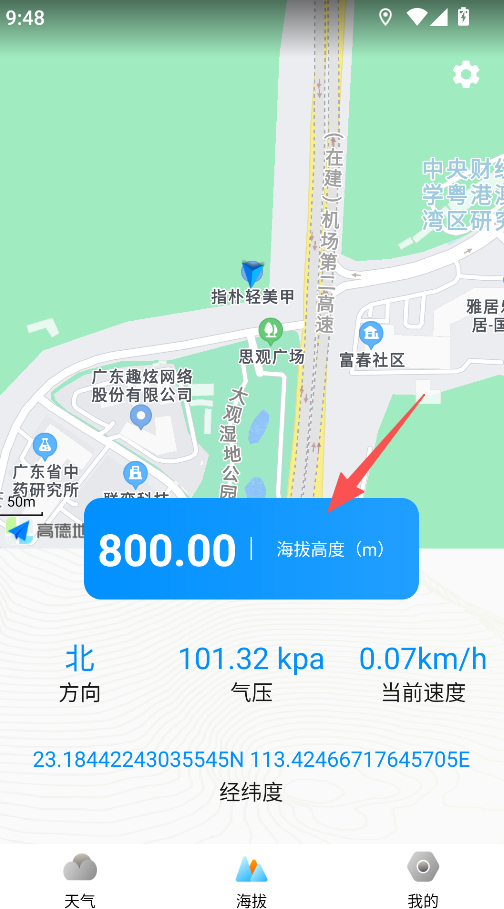 3、進(jìn)入海拔板塊、查看海拔高度、同時(shí)獲取氣壓經(jīng)緯度等數(shù)據(jù)。
