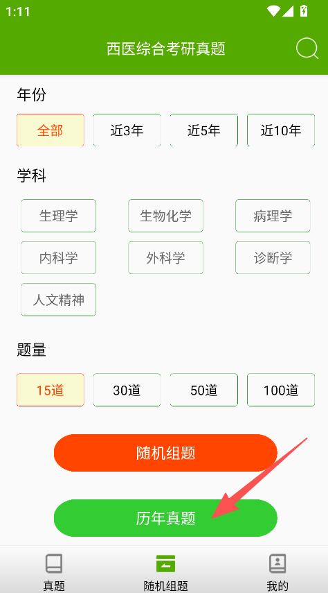 3、組題模式多元,既有隨機組題模式,又可按年份查看歷年真題,適配不同復習需求。