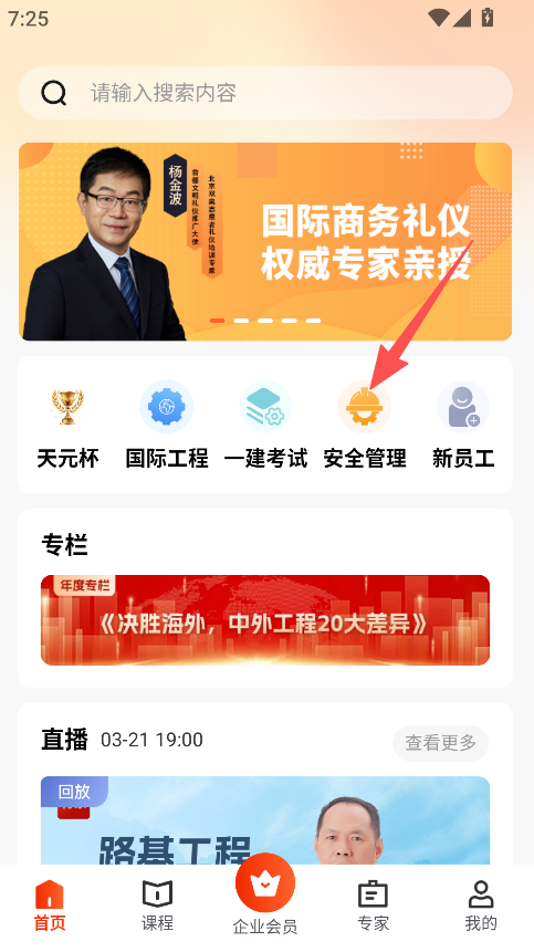 2、板塊設置豐富,有安全管理、國際工程等入口,還有專欄、直播回放板塊,學習場景多元。