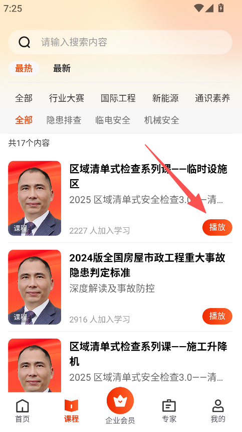 2、課程分類細致,按最熱、最新及隱患排查、臨電安全等分類,課程查找便捷。