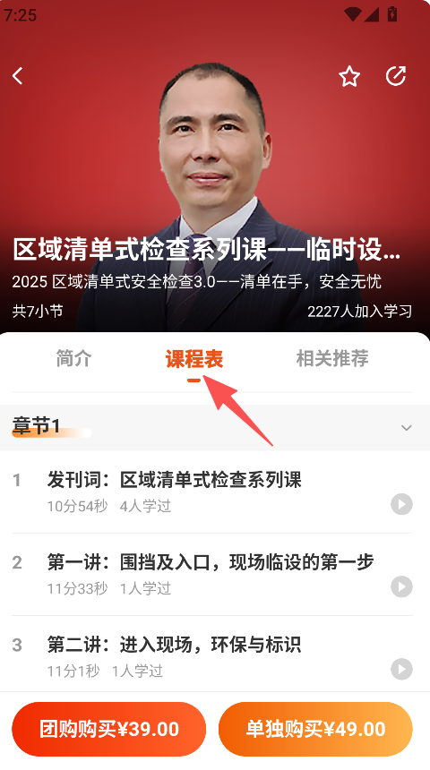 3、進入具體課程,查看課程表,選擇章節學習,也可按需團購或單獨購買課程。