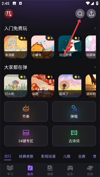 1、在“曲庫”頁面,點擊右上角的搜索按鈕,進入搜索界面。