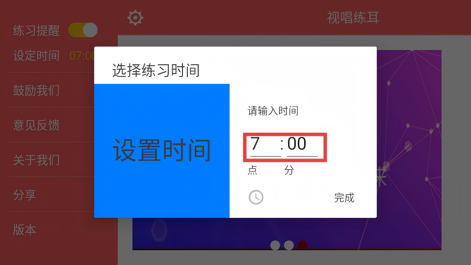 3、在【選擇練習時間】彈窗中,輸入時間的【點】和【分】后點擊【完成】即可設置練習時間。