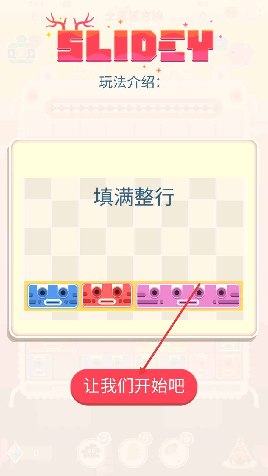 1、游戲玩法為【填滿整行】,按紅色箭頭指示點擊【讓我們開始吧】進入游戲。