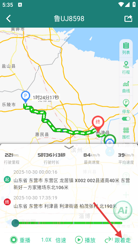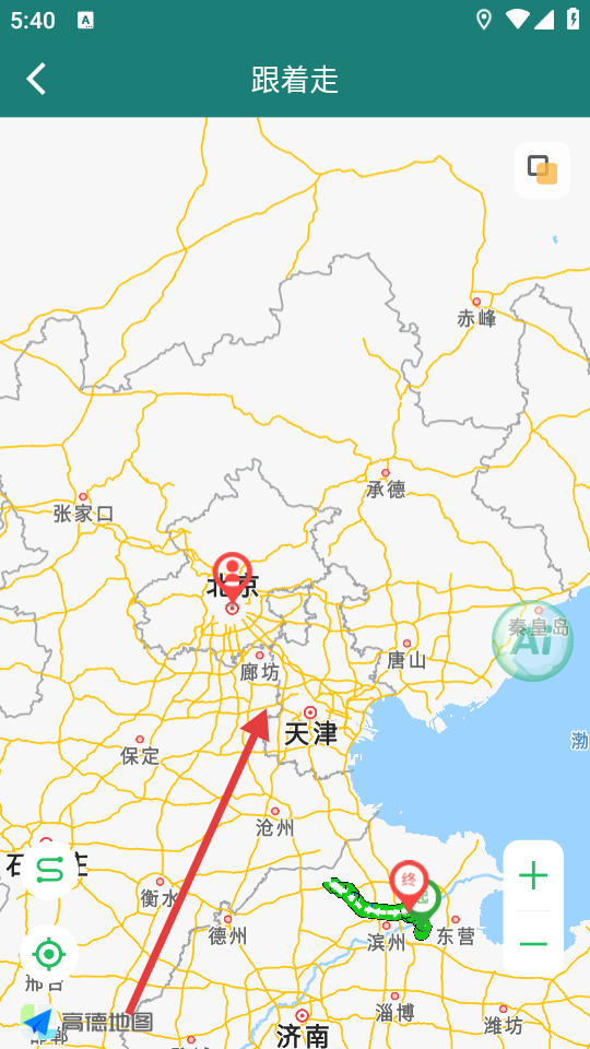 3、在軌跡詳情頁面,點擊“跟著走”,進入軌跡跟隨地圖頁面。