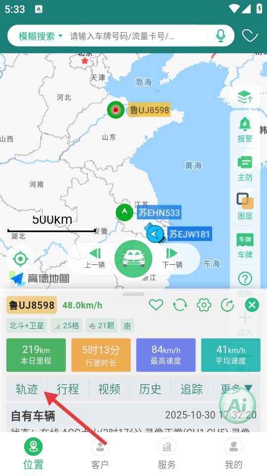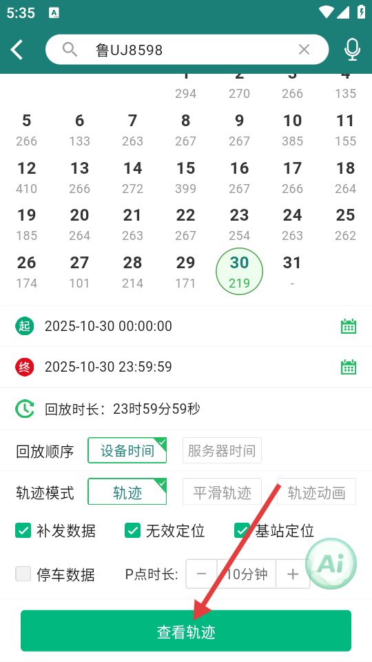 2、在軌跡查詢頁面,選擇車輛“魯UJ8598”及日期后,點擊“查看軌跡”,進入軌跡詳情頁面。