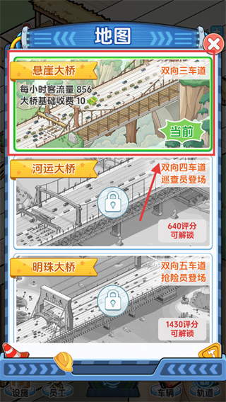 1、經營【懸崖大橋】,憑【856】客流量、【10】基礎收費積累收益與評分,解鎖后續大橋。