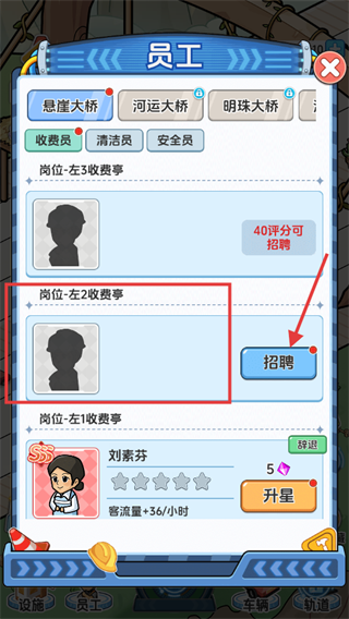 2、為【懸崖大橋】-【左2收費亭】招聘收費員,升星【劉素芬】提升客流量【36/小時】。