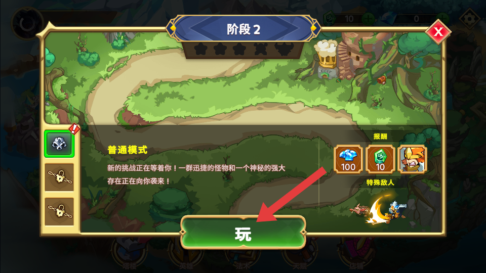 1、點擊【玩】按鈕,進入階段2的普通模式戰斗,開啟新的防御挑戰。