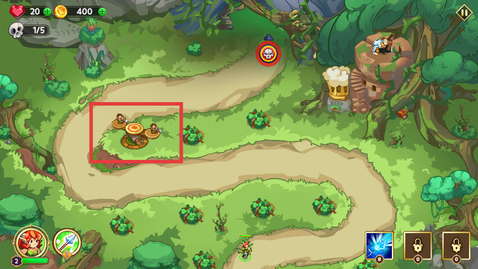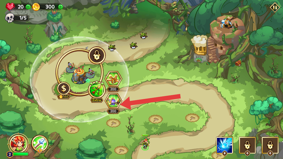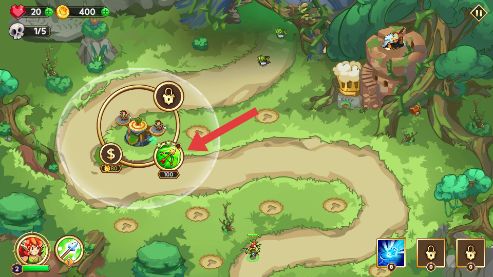 3、積累金幣后,可升級防御塔或建造更高級的防御塔(如綠色弓箭塔),提升防御能力。