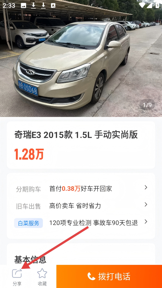 3、在【奇瑞E3】詳情頁,可以點擊左下角【分享】。