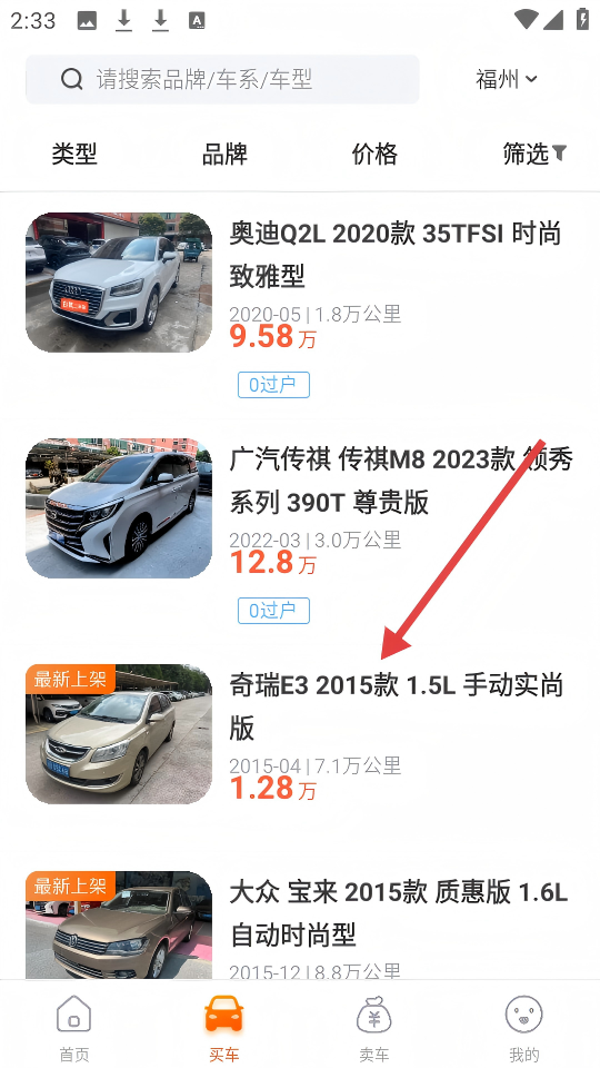 2、【買車】頁面可瀏覽含【奇瑞E3】在內的車型。