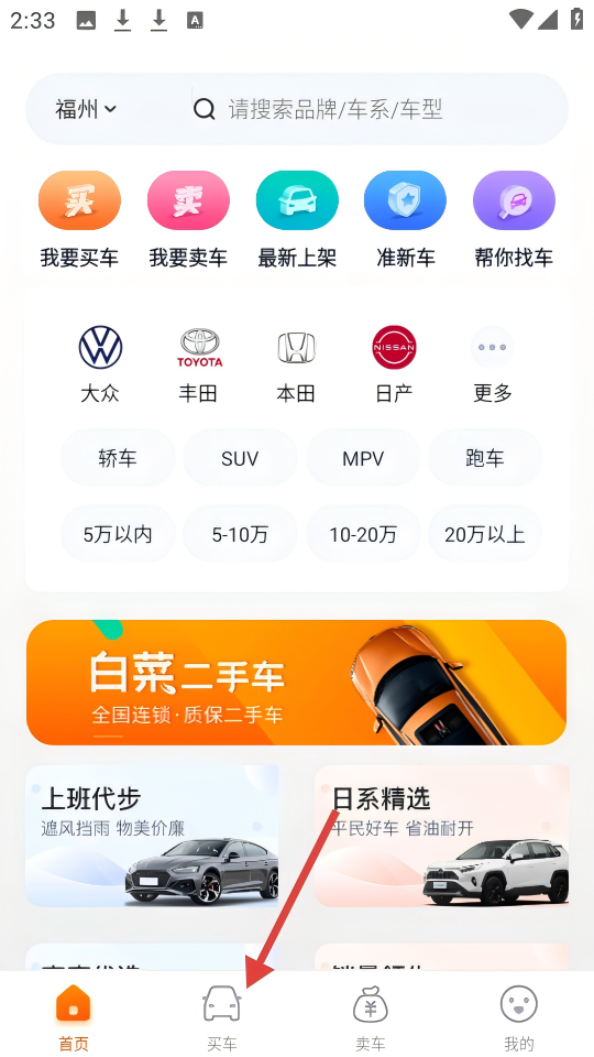 1、進入軟件,【首頁】點擊【買車】進入選車頁面。