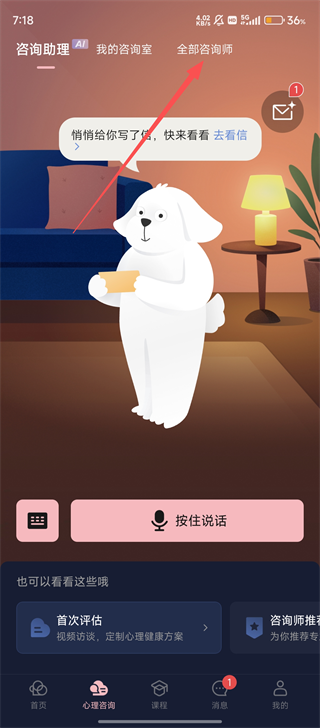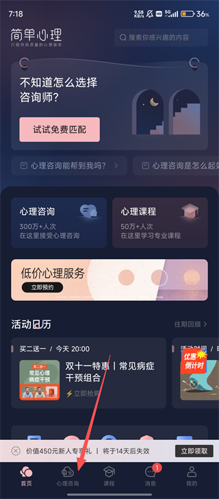 1、在主界面,點擊底部“心理咨詢”選項,進入心理咨詢頁面。