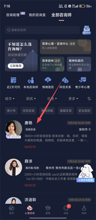 2、在心理咨詢頁面,選擇目標咨詢師,進入咨詢師詳情頁面。