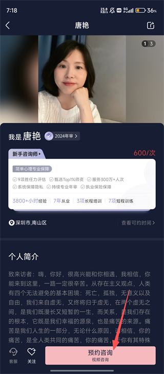 4、進入咨詢師詳情頁后,點擊【預約咨詢】,即可預約視頻咨詢,開啟心理關懷之旅啦。