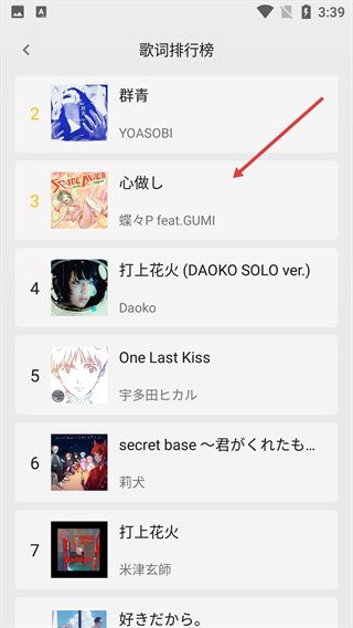4、在歌詞排行榜中選擇想要聽的歌曲。