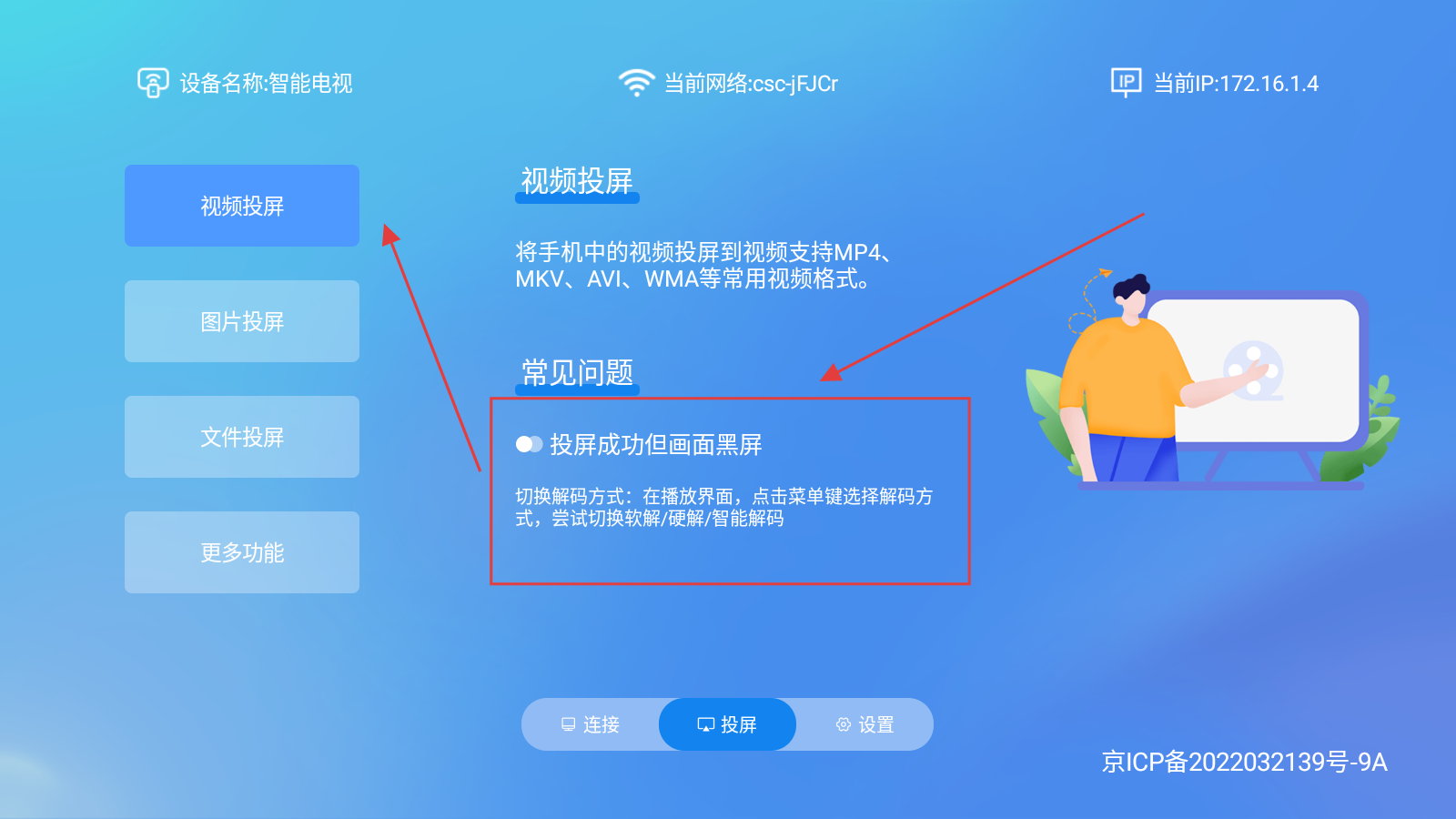 2、進入投屏界面,可選擇【視頻投屏】,還能查看【常見問題及解決方法】,享受視頻投屏體驗。