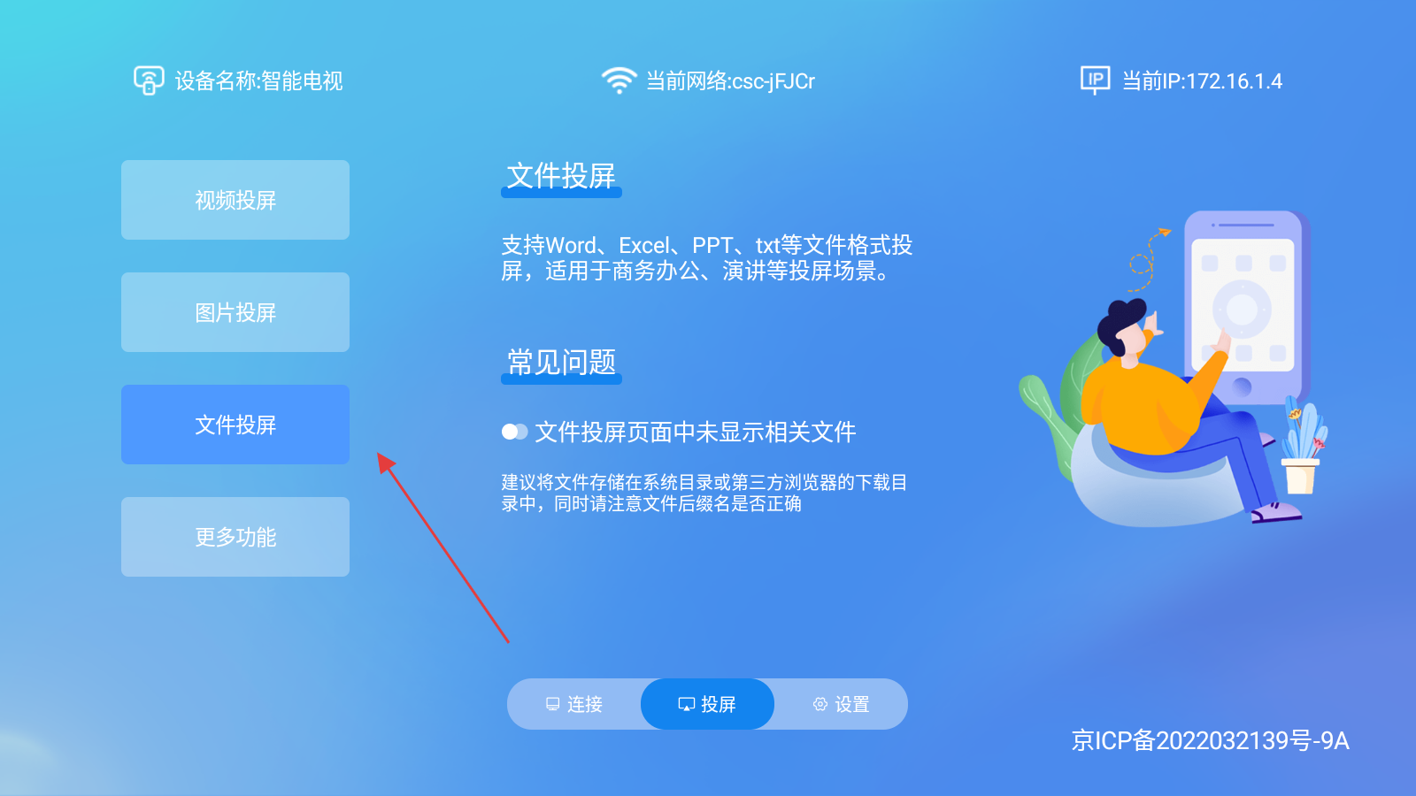 4、進入投屏界面,可【選擇文件投屏】,滿足商務辦公等投屏需求。