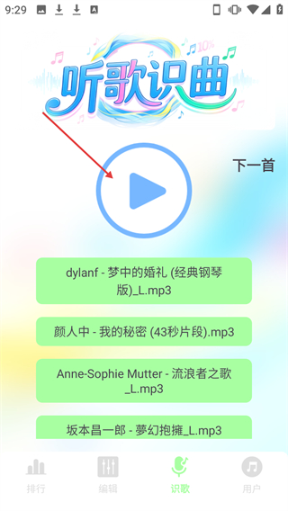 3、進入【聽歌識曲】界面,點擊中間播放按鈕即可進行識曲。