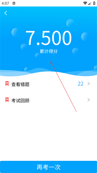 4、答完題交卷后,進入考試結果頁面,可查看累計得分、查看錯題或考試回顧。