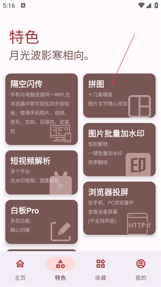 2、在特色頁面選擇【拼圖】工具,進入圖片選擇界面。