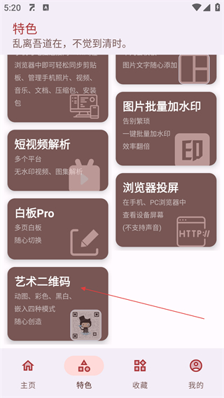 3、在特色頁面,選擇【藝術二維碼】工具,進入藝術二維碼的編輯界面。