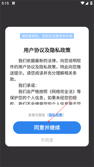 1、閱讀【用戶協議及隱私政策】后,點擊【同意并繼續】按鈕。